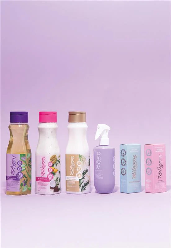 Incluye el shampoo ultranutritivo premium con gel de aloe vera 100% natural, el acondicionador milagro herbal dermatológicamente comprobado, con extracto de arroz y de romero, el biorepolarizador capilar con provitamina b5, pulpa de coco y vitamina E. Más la línea completa de rescate instantáneo: el elixir revitalizante y el experto en rescate, con tecnología de reparación capilar y resultados inmediatos.
